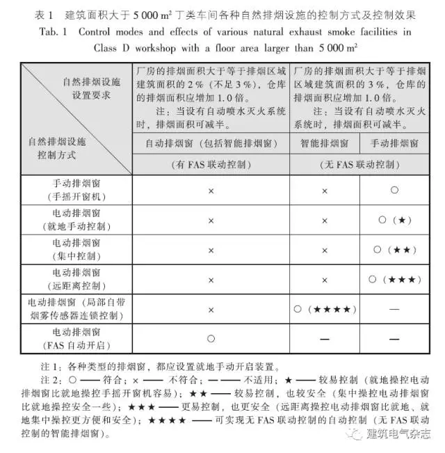為方便理解和分析,下面以建筑面積大于5000m2丁類車間應設排煙設施(以自然排煙設施)舉例,將設置自動排煙窗、智能排煙窗和手動排煙窗后的相關內容,列表進行說明,如表1所示。